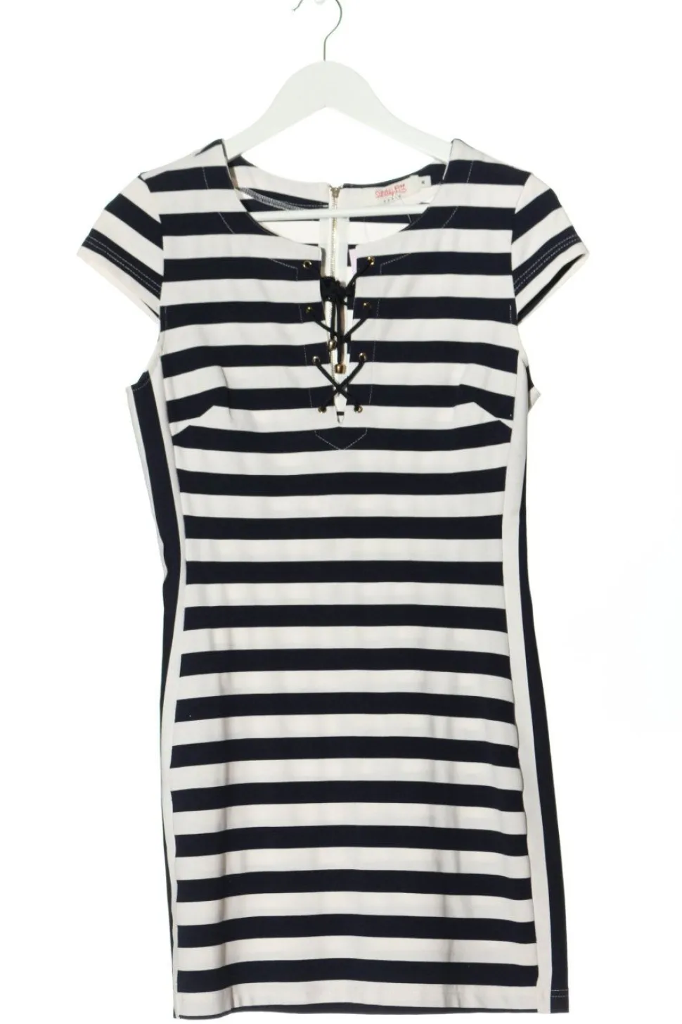 - Schlüssellochausschnitt, U-Ausschnitt, Reißverschluss hinten, Schnürverschluss, Streifenmuster, Casual-Look, Street-Fashion-Look