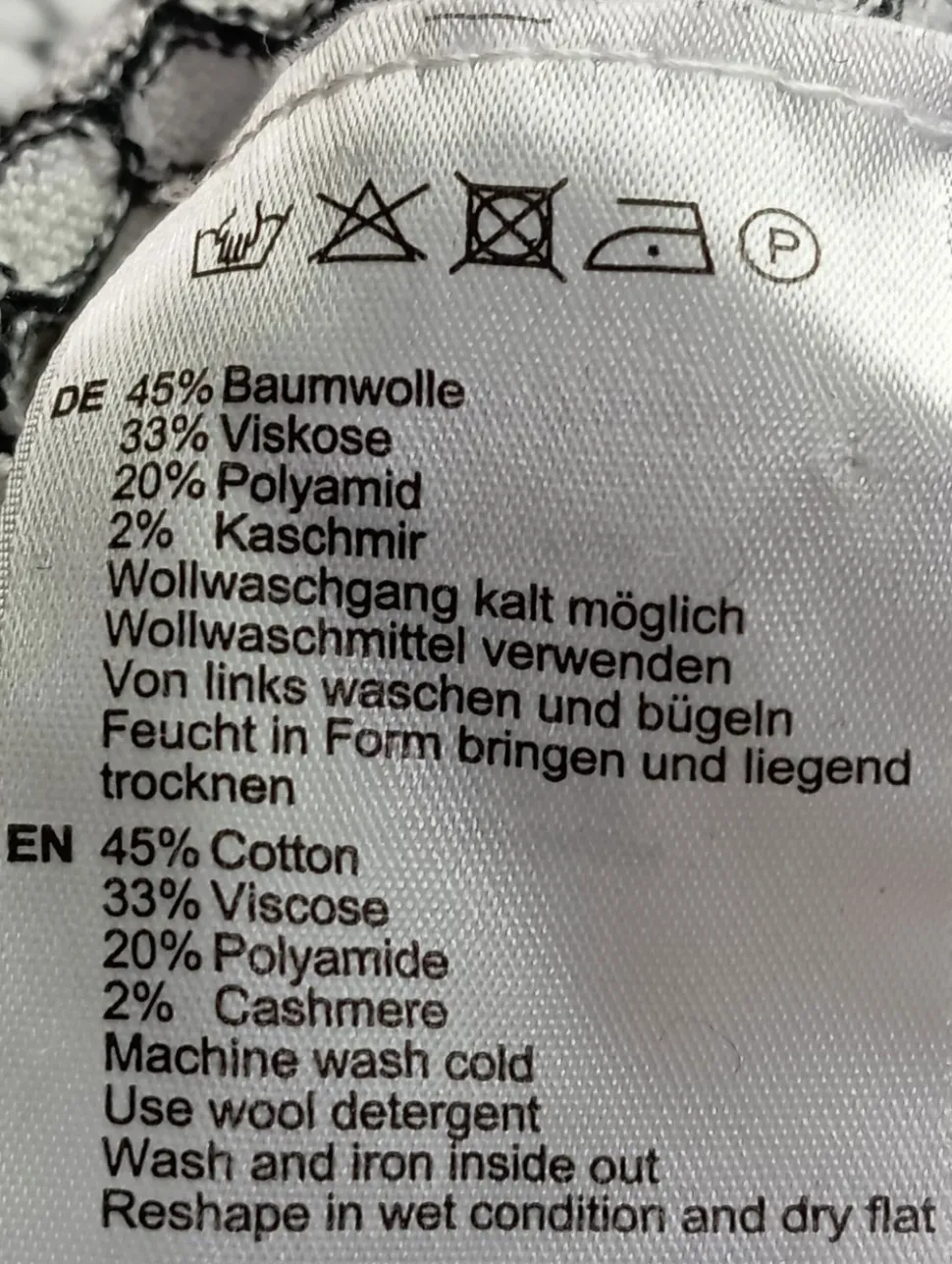 - Außenmaterial: 45% Baumwolle, 33% Viskose, 20% Polyamid, 2% Kaschmir