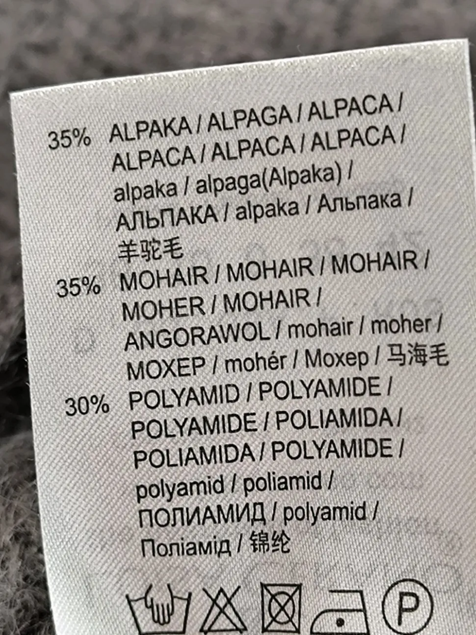- Außenmaterial: 35% Alpaka/Wolle/Tierhaar, 35% Mohair/Wolle/Tierhaar, 30% Polyamid