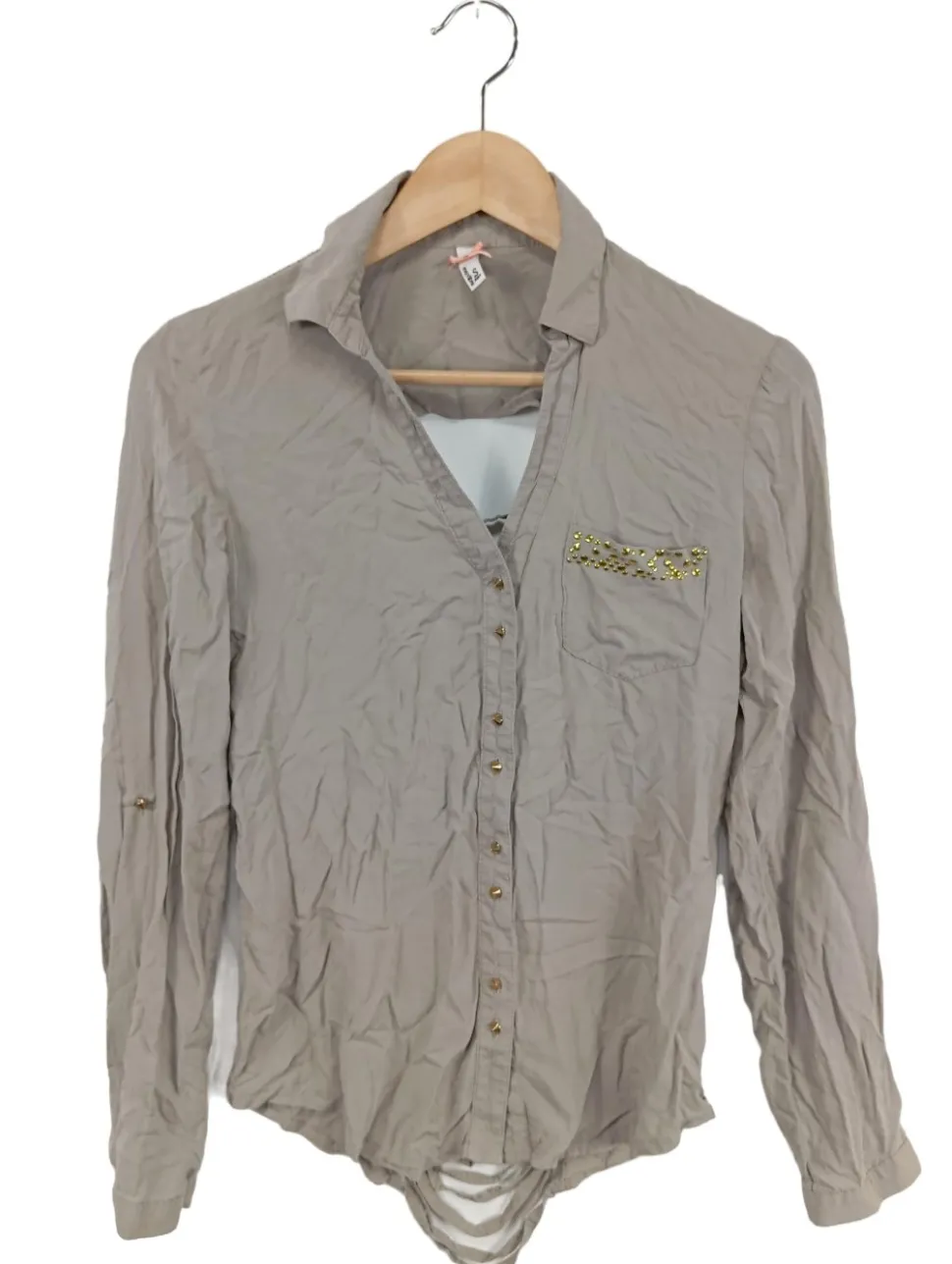 - V-Ausschnitt, Hemdkragen, Knopfverschluss am Ärmelsaum, Knopfverschluss, aufgesetzte Tasche (einzeln), Casual-Look, Glanz-Optik, schlichter Stil, Used-Optik