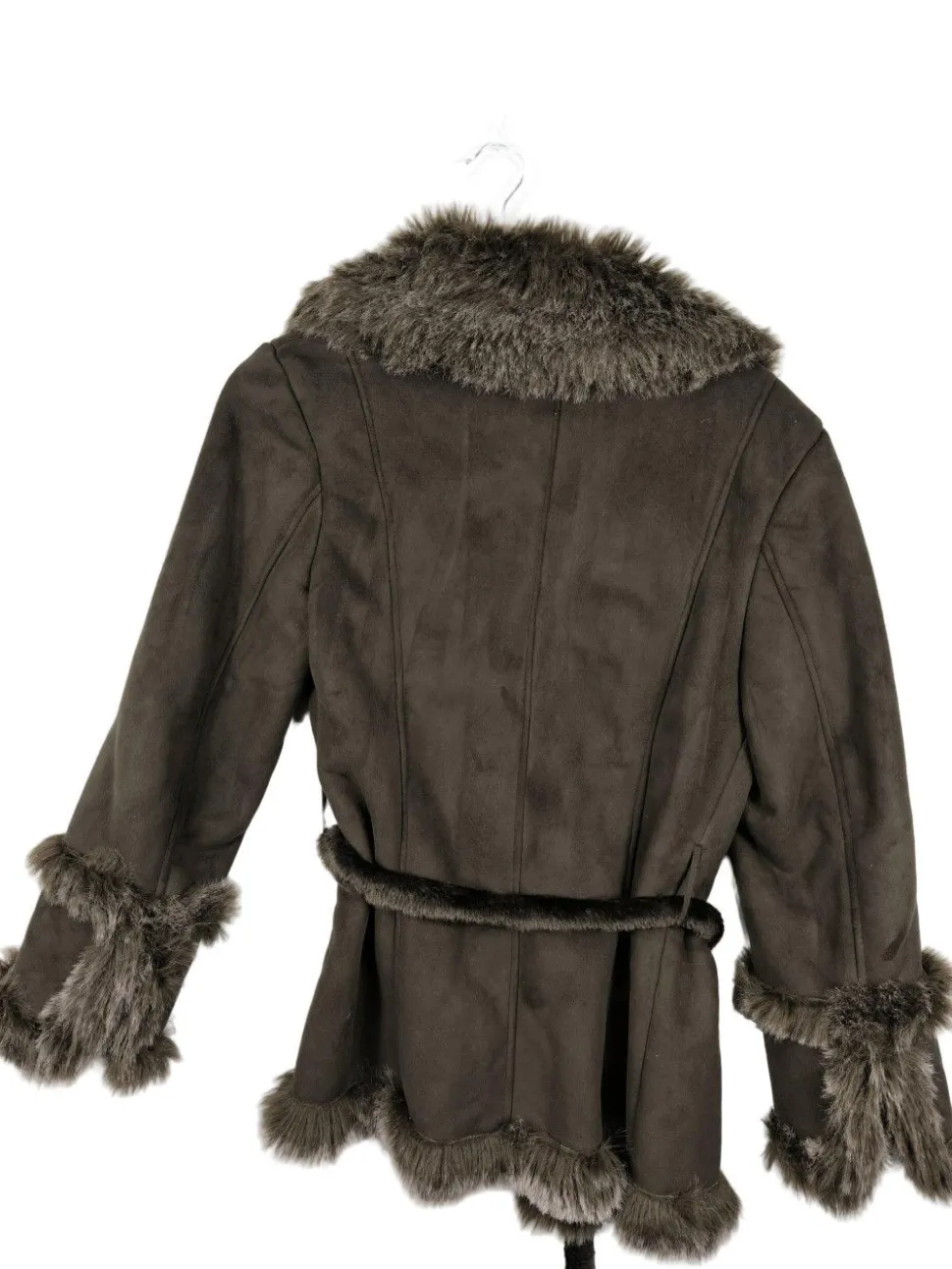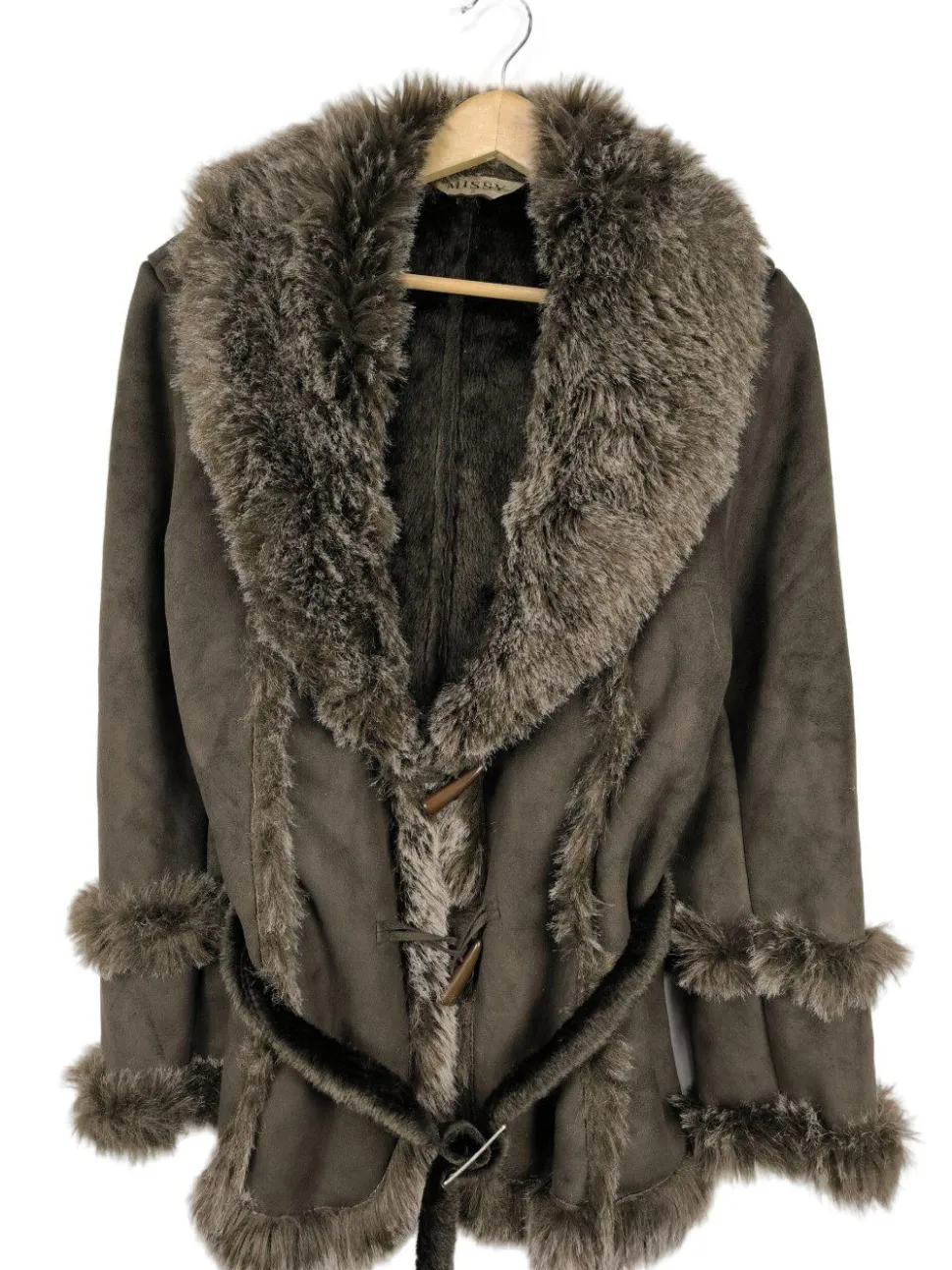 - tiefer V-Ausschnitt, Kunstfellkragen, Gürtelverschluss, Knebelverschluss, Nahteingriffstaschen, Casual-Look, Street-Fashion-Look