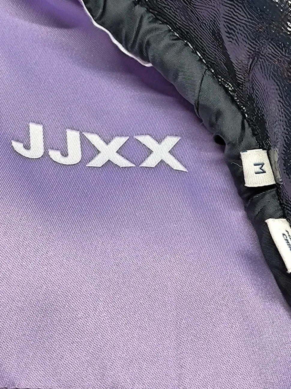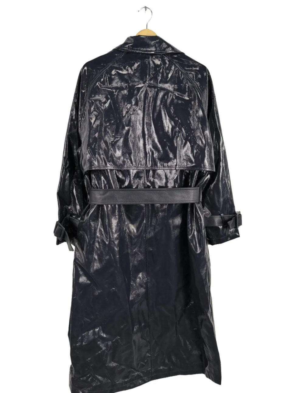 - V-Ausschnitt, Reverskragen, Ärmelriegel, doppelreihiger Knopfverschluss, Knopfverschluss, aufgesetzte Pattentaschen, extravaganter Stil, Glanz-Optik, Vintage-Look