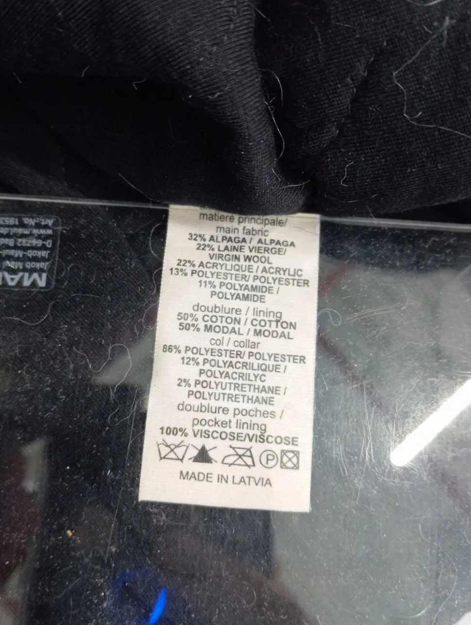 - Außenmaterial: 32% Alpaka/Wolle/Tierhaar, 22% Wolle, 22% Polyacryl, 13% Polyester, 11% Polyamid