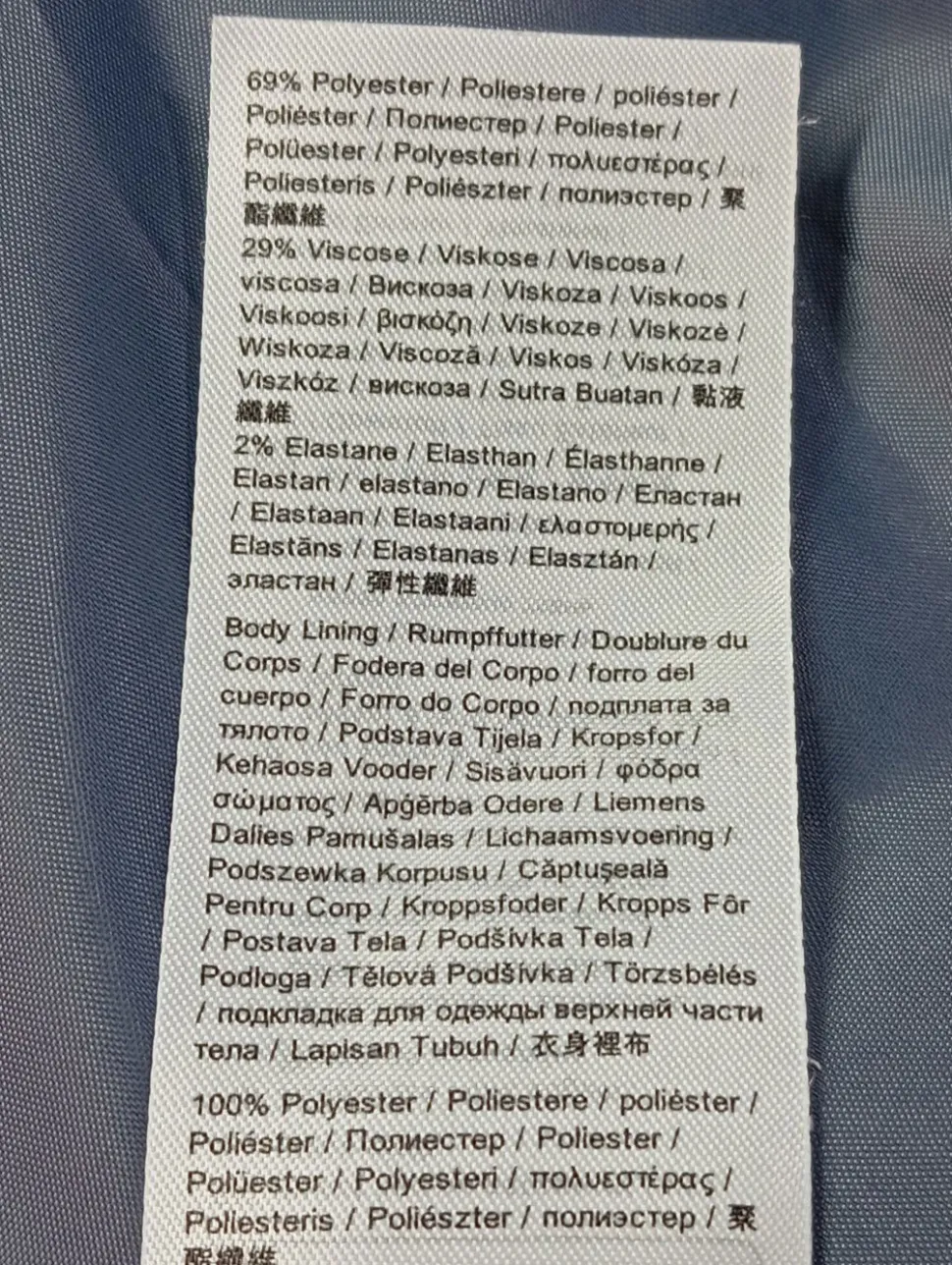 - Außenmaterial: 69% Polyester, 29% Viskose, 2% Elasthan