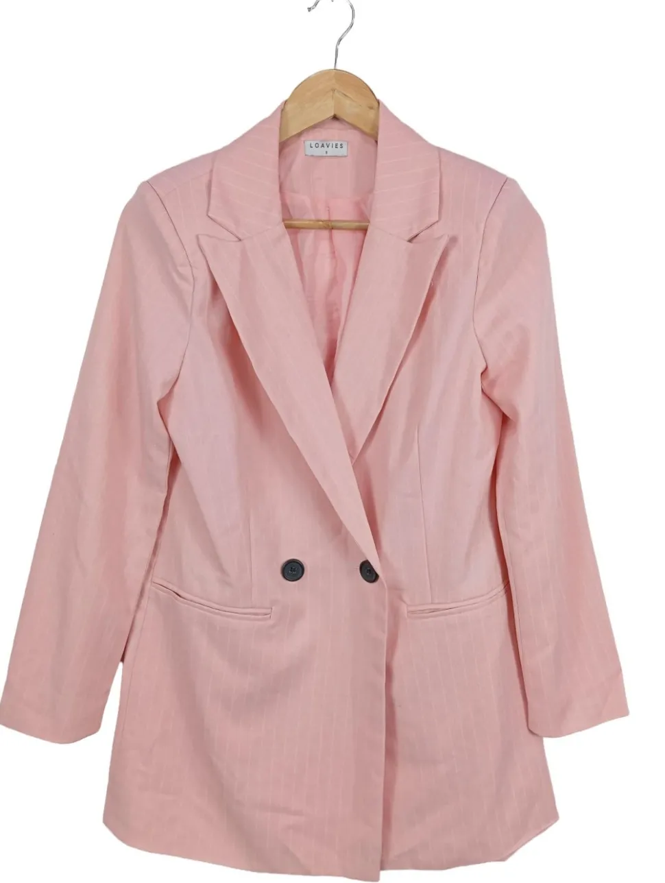 - V-Ausschnitt, Reverskragen, Bund am Ärmelsaum, doppelreihiger Knopfverschluss, Paspeltaschen, Streifenmuster, Business-Look, Casual-Look