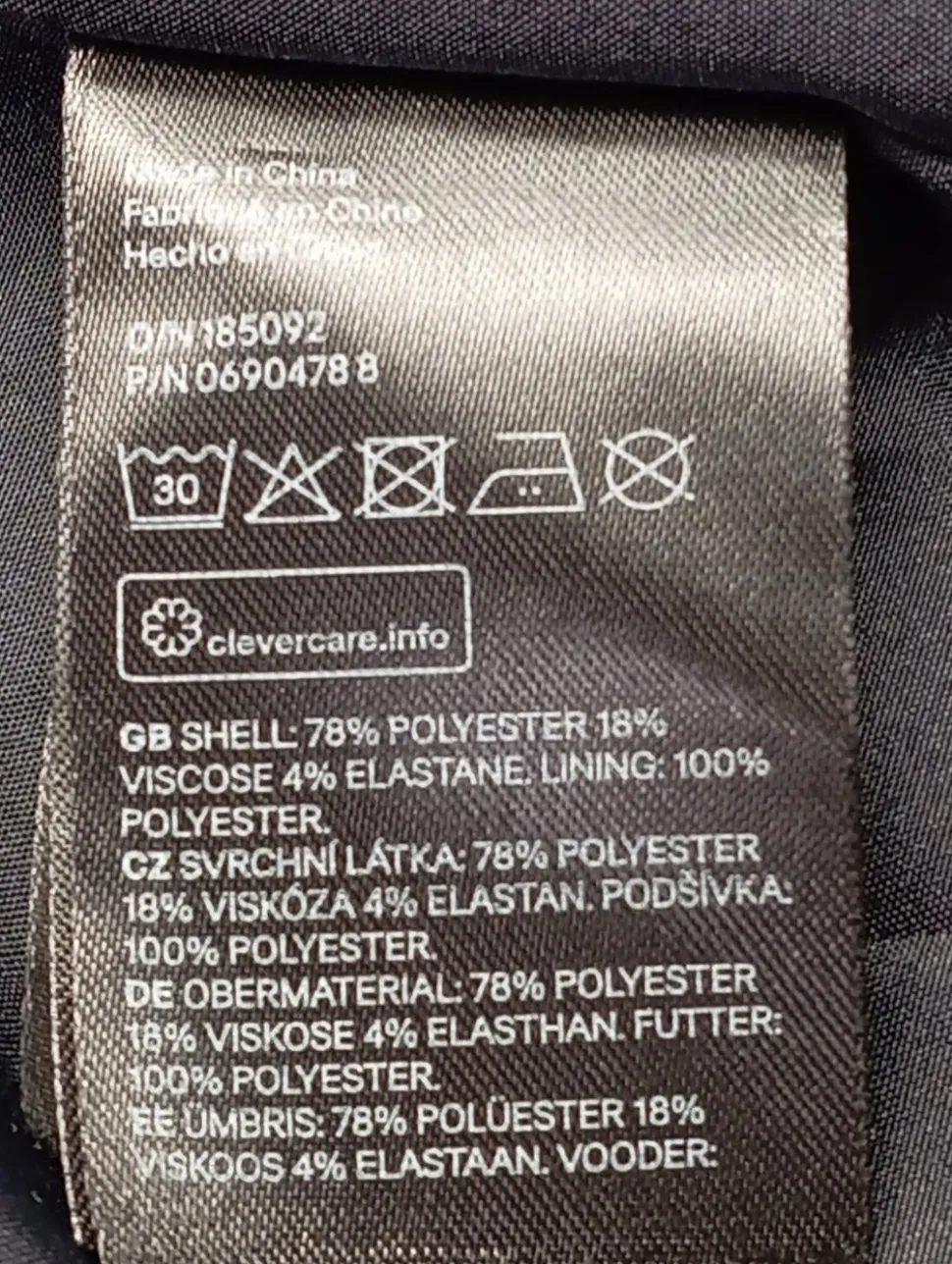 - Außenmaterial: 78% Polyester, 18% Viskose, 4% Elasthan