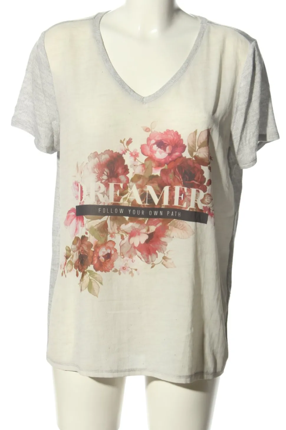 - V-Ausschnitt, Bund am Ärmelsaum, Blumenmuster, meliert, Schriftzug gedruckt, Casual-Look, schlichter Stil, Street-Fashion-Look