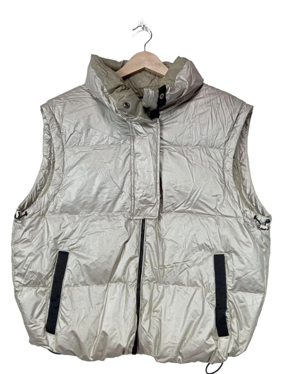 - hochgeschnittener Kragen, Druckknopfverschluss, Reißverschluss, Leistentaschen, Steppmuster, Casual-Look, Glanz-Optik, Street-Fashion-Look, Used-Optik