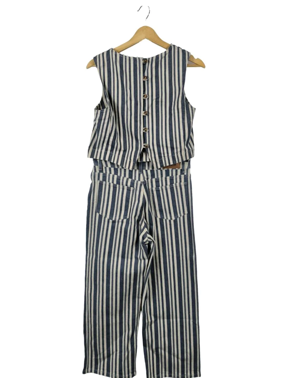 - Rundhalsausschnitt, Knopfverschluss, Knopfverschluss hinten, aufgesetzte Gesäßtaschen, Eingriffstaschen, Streifenmuster, Casual-Look, Street-Fashion-Look