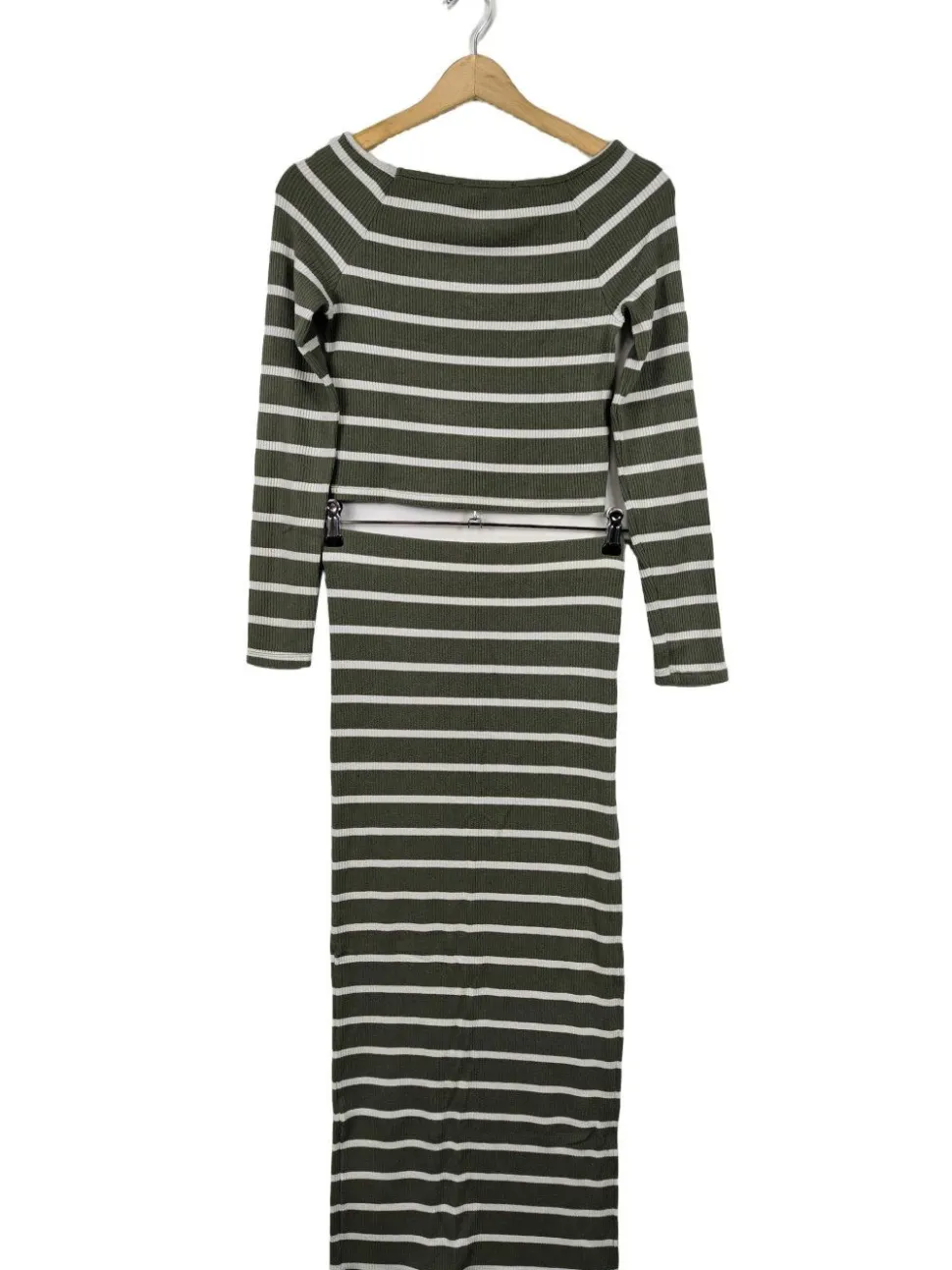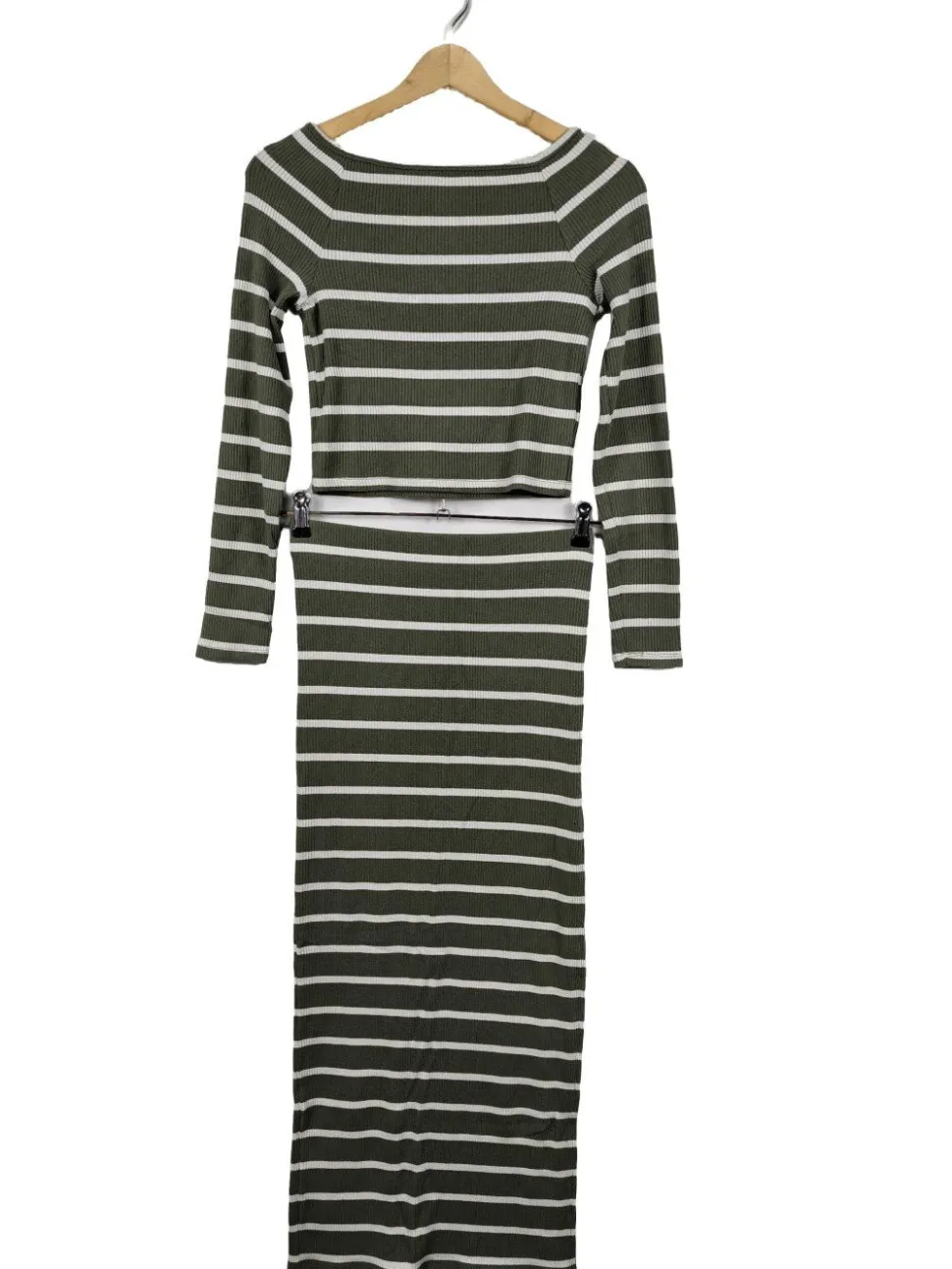 - Bershka Strick Twin Set, khaki-weiß Streifenmuster