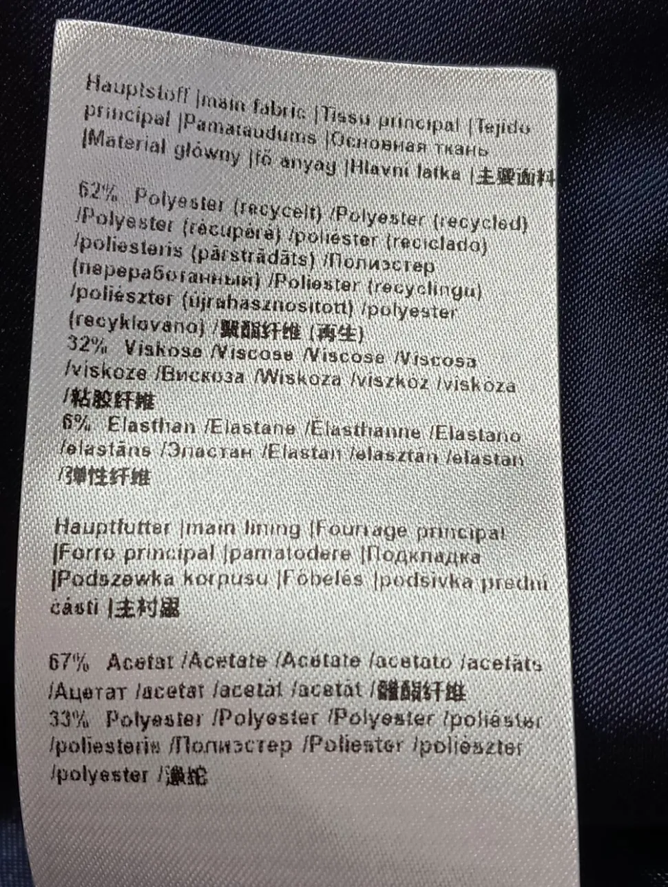 - Außenmaterial: 62% Polyester, 32% Viskose, 6% Elasthan