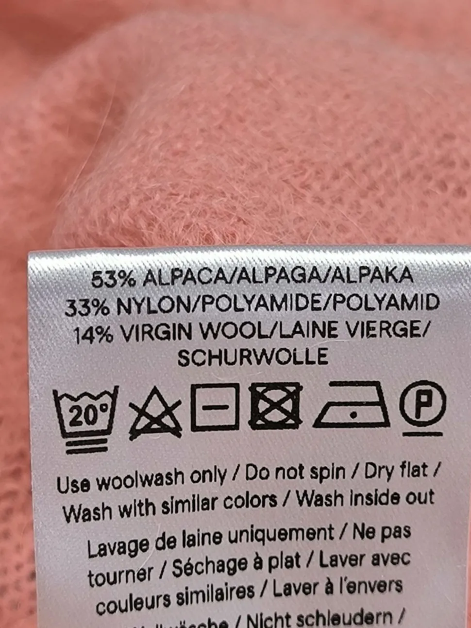 - Außenmaterial: 53% Alpaka/Wolle/Tierhaar, 33% Nylon, 14% Wolle
