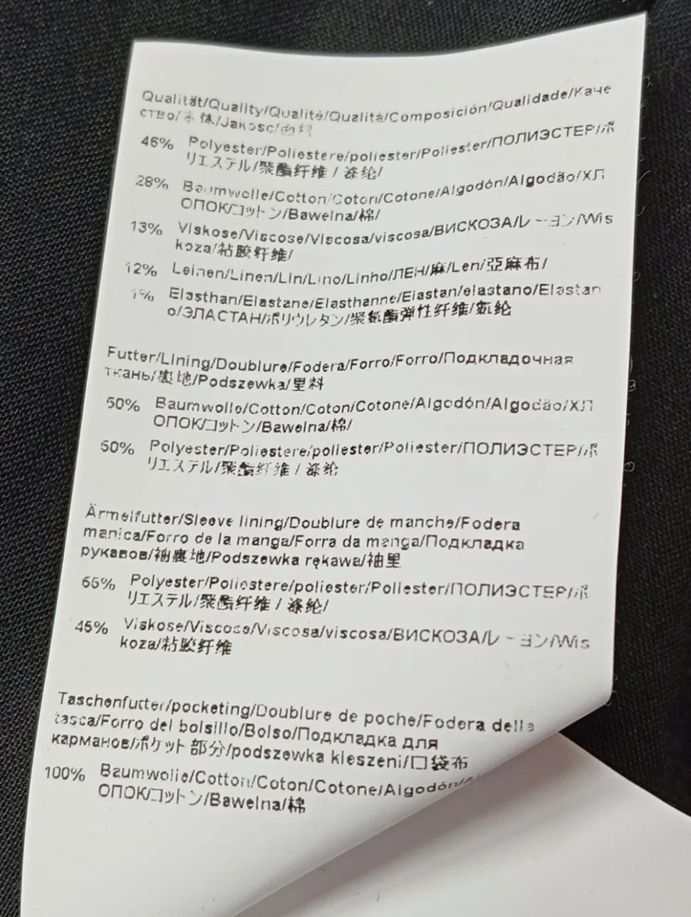 - Außenmaterial: 45% Polyester, 28% Baumwolle, 13% Viskose, 12% Leinen