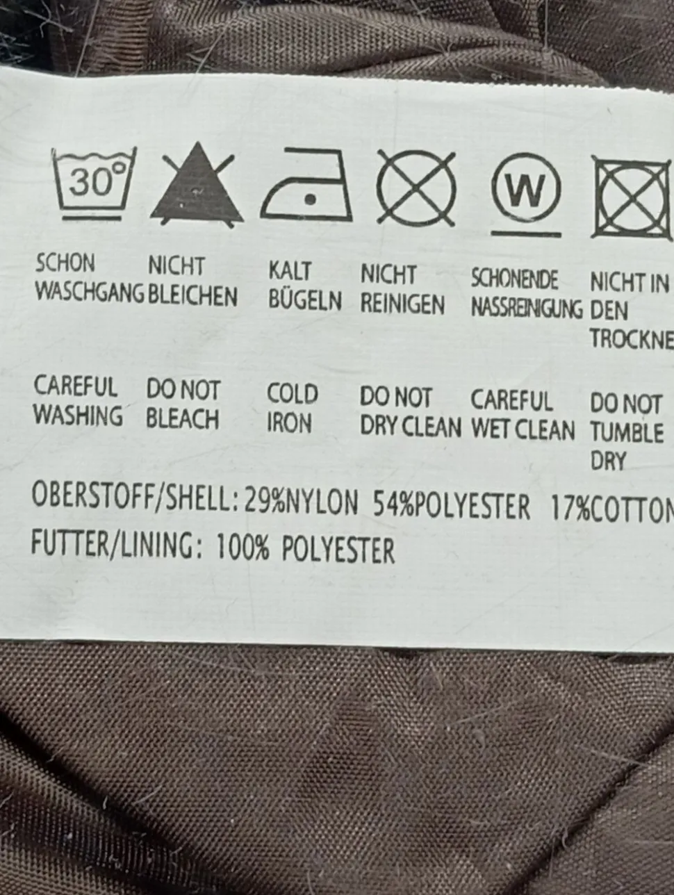 - Außenmaterial: 29% Nylon, 54% Polyester, 17% Baumwolle