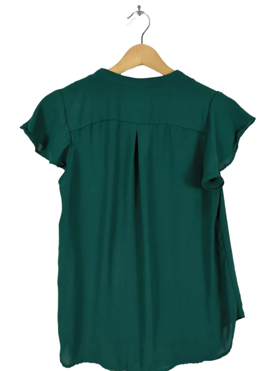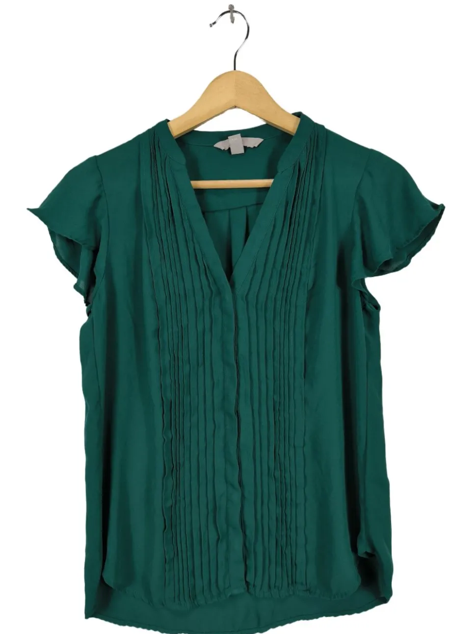 - V-Ausschnitt, Stehkragen, Wellkanten am Ärmelsaum, Knopfverschluss, Casual-Look, Elegant, Vintage-Look