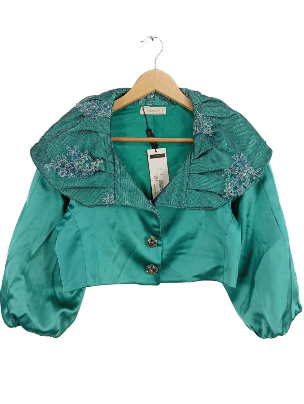 - Details: Kastenform Silhouette, Wiener Nähte, Metallknöpfe, Stickereiverzierung, Zierknöpfe