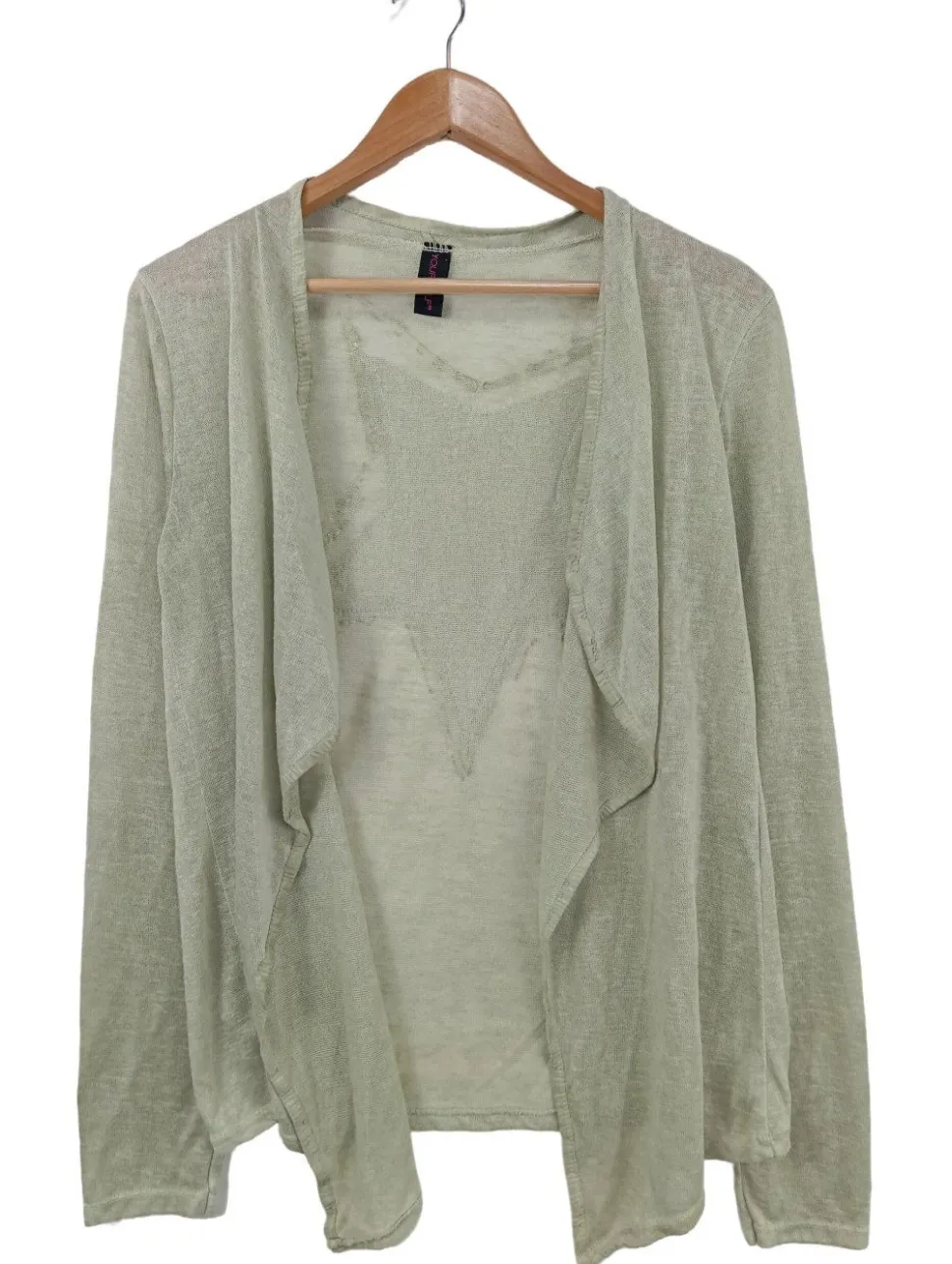 - tiefer V-Ausschnitt, Umlegekragen, Bund am Ärmelsaum, ohne Verschluss (wird offen getragen), meliert, Schriftzug gestickt, Zopfmuster, Casual-Look, Glanz-Optik, Street-Fashion-Look