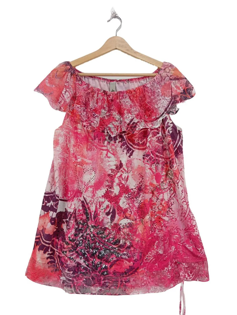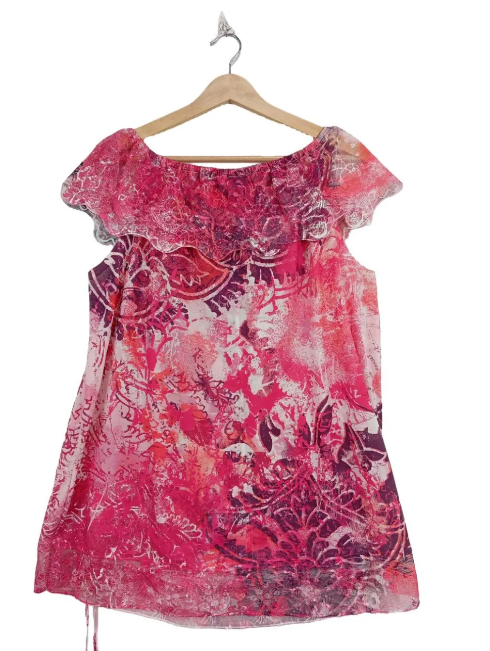 - schulterfrei, angeschnittener Kragen, Raffung am Ärmelsaum, abstraktes Muster, Allover-Druck, Casual-Look, schlichter Stil