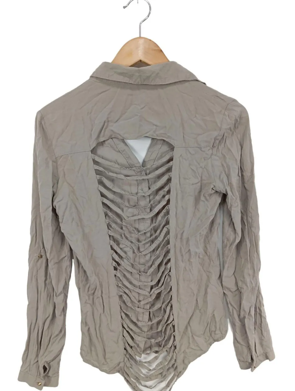- V-Ausschnitt, Hemdkragen, Knopfverschluss am Ärmelsaum, Knopfverschluss, aufgesetzte Tasche (einzeln), Casual-Look, Glanz-Optik, schlichter Stil, Used-Optik