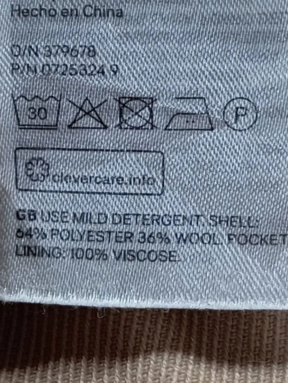 - Außenmaterial: 64% Polyester, 36% Wolle