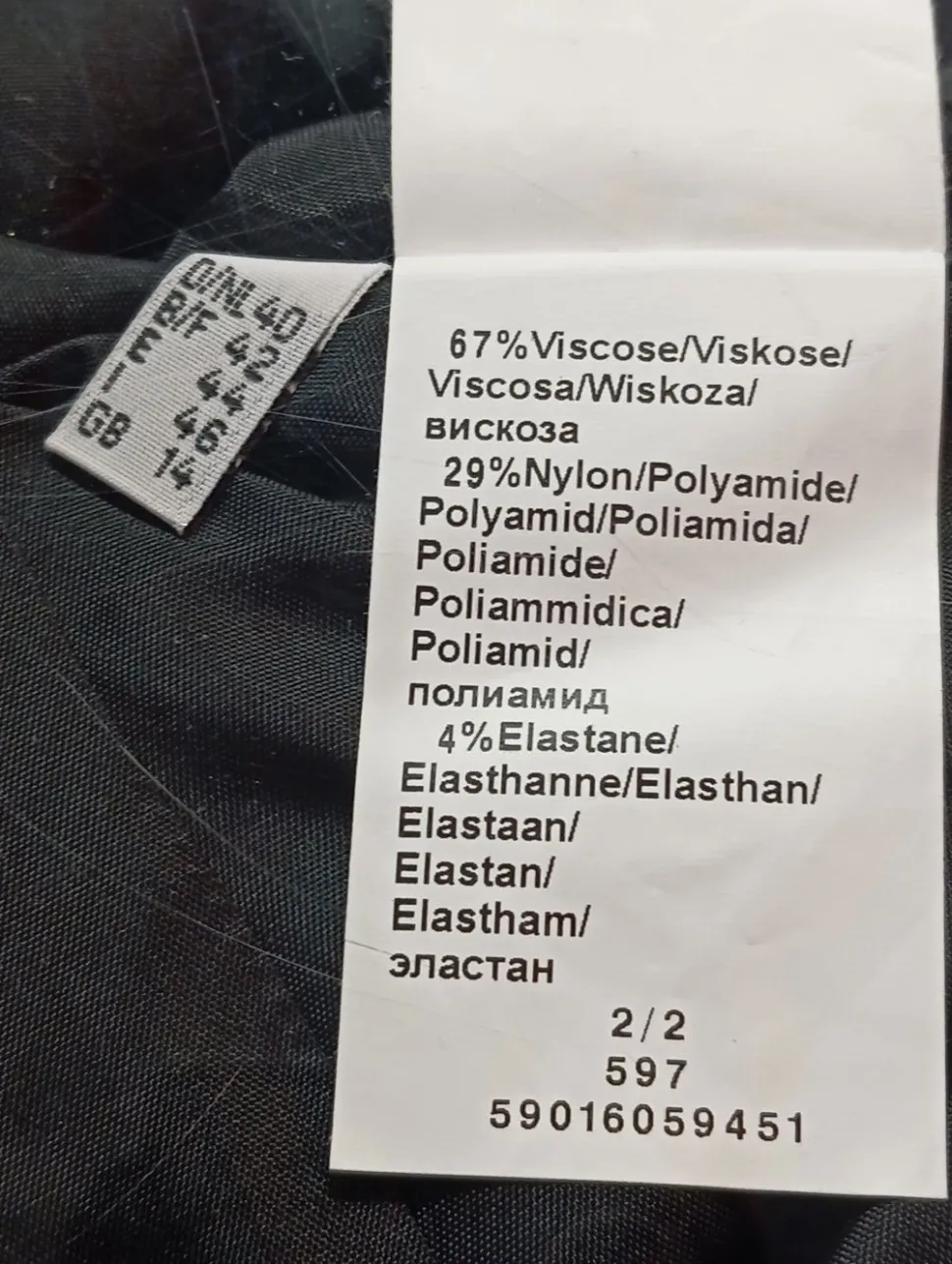 - Außenmaterial: 67% Viskose, 29% Nylon, 4% Elasthan