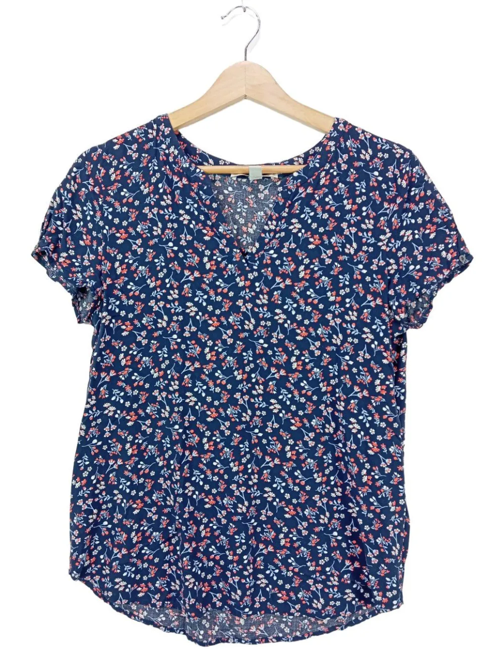 - Rundhalsausschnitt, V-Ausschnitt, Knopfverschluss am Ärmelsaum, Allover-Druck, Blumenmuster, Casual-Look, Street-Fashion-Look