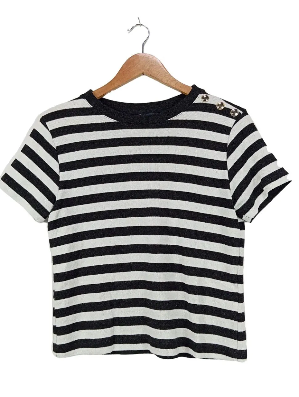 - Rundhalsausschnitt, angeschnittener Kragen, Bund am Ärmelsaum, Knopfverschluss, Streifenmuster, Casual-Look, schlichter Stil, Street-Fashion-Look