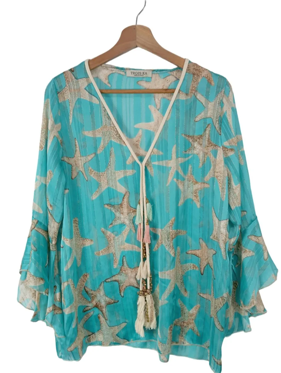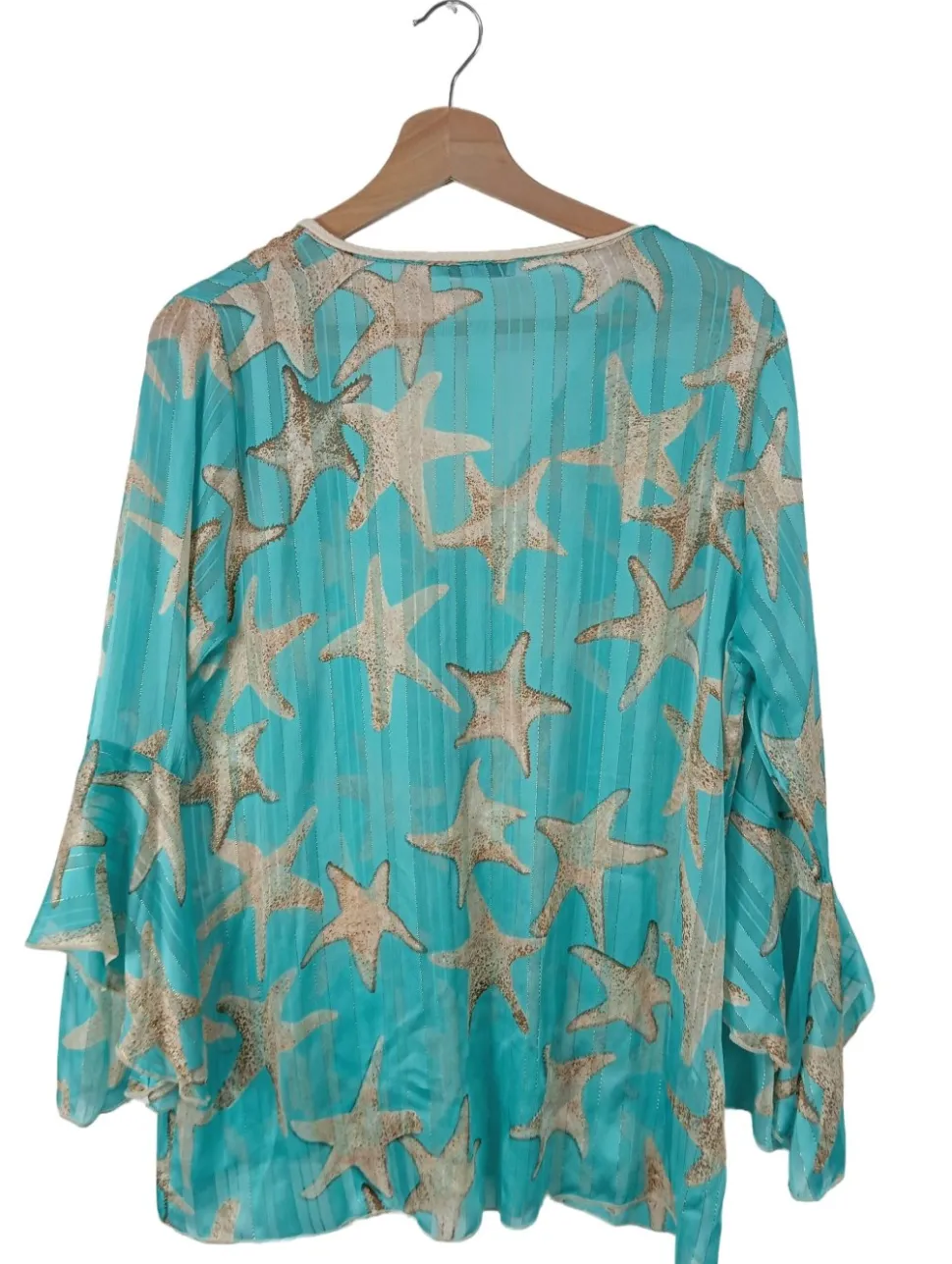 - V-Ausschnitt, Rüschenmanschette, Allover-Druck, Motivdruck, Casual-Look, schlichter Stil, Transparenz-Optik