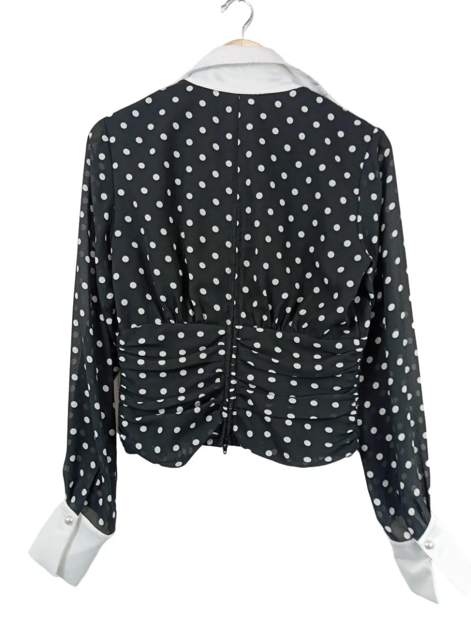 - V-Ausschnitt, Hemdkragen, Manschetten, Nahtreißverschluss, Reißverschluss hinten, Punktemuster, Casual-Look, Elegant