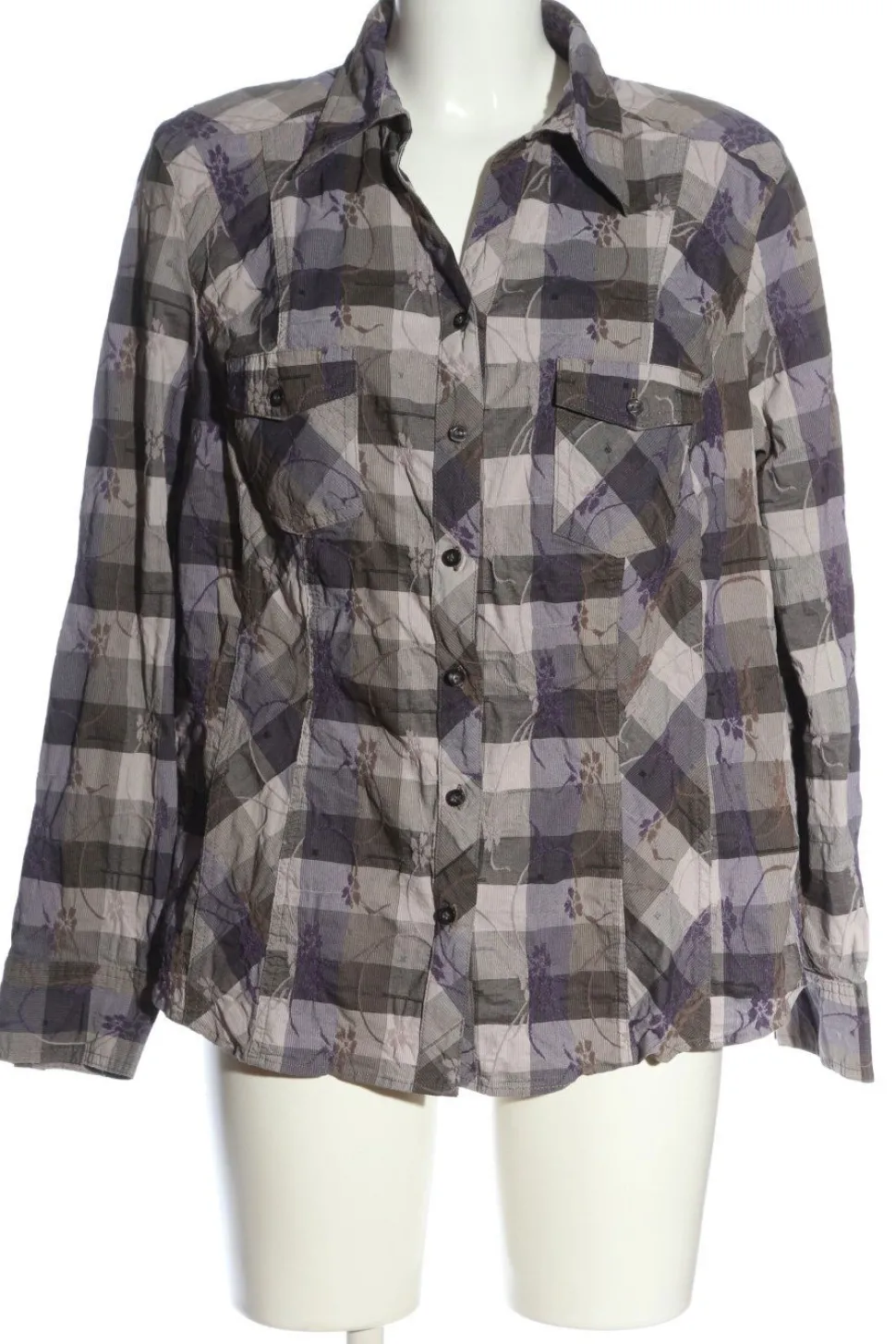 - V-Ausschnitt, Kelchkragen, Hemdärmelschlitz, Knopfverschluss, aufgesetzte Pattentaschen, Taschen mit Knopfverschluss, Allover-Druck, Blumenmuster, Karomuster, Business-Look, klassischer Stil