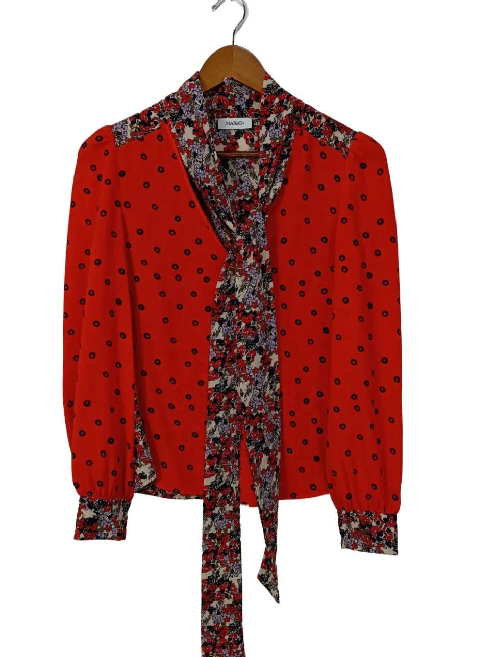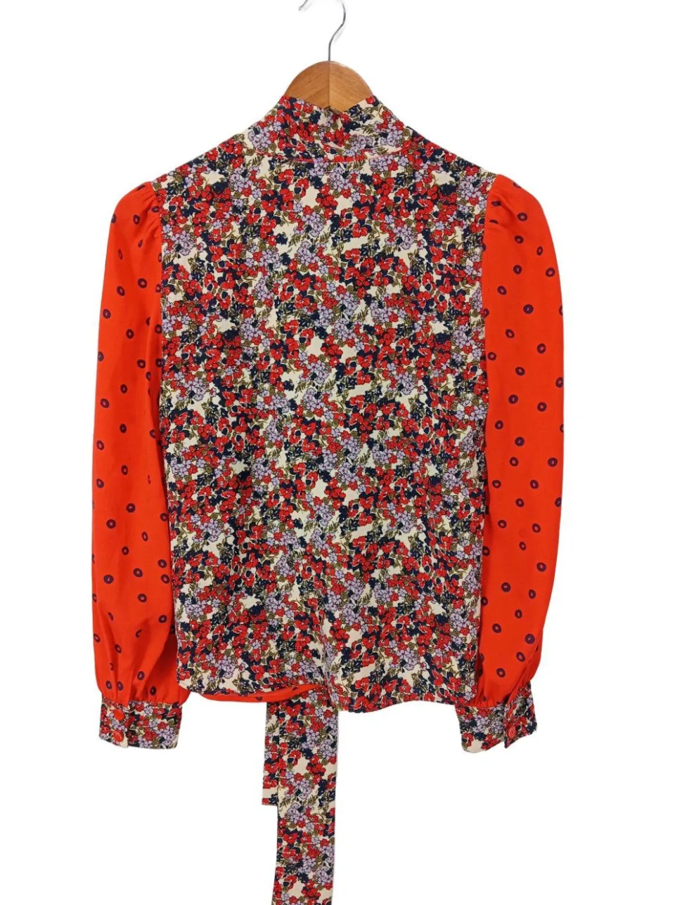 - Schleifenkragen, Knopfverschluss am Ärmelsaum, Knotenverschluss, Blumenmuster, Punktemuster, Casual-Look, Elegant, Vintage-Look