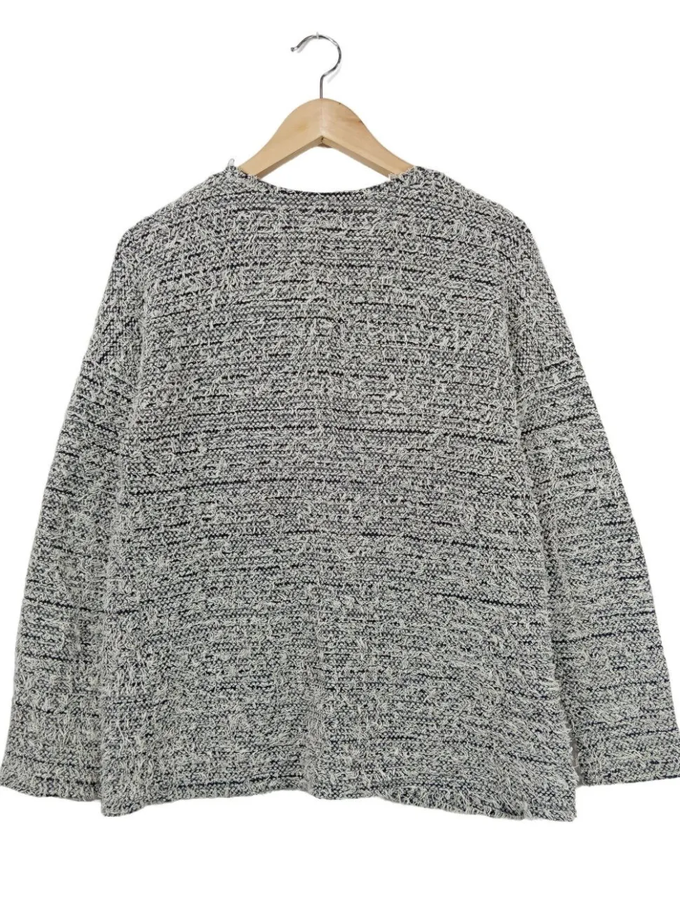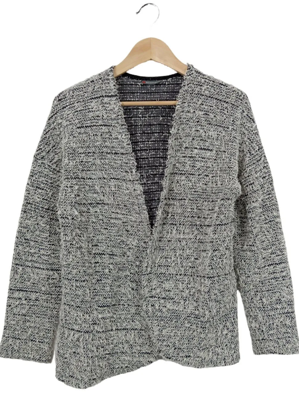 - tiefer V-Ausschnitt, Bund am Ärmelsaum, ohne Verschluss (wird offen getragen), meliert, Streifenmuster, Zopfmuster, Casual-Look, Street-Fashion-Look