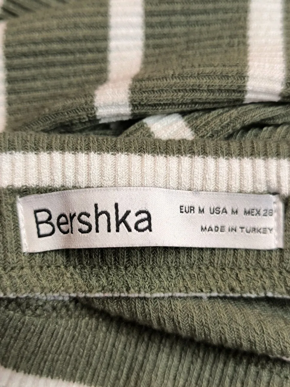 - Bershka Strick Twin Set, khaki-weiß Streifenmuster