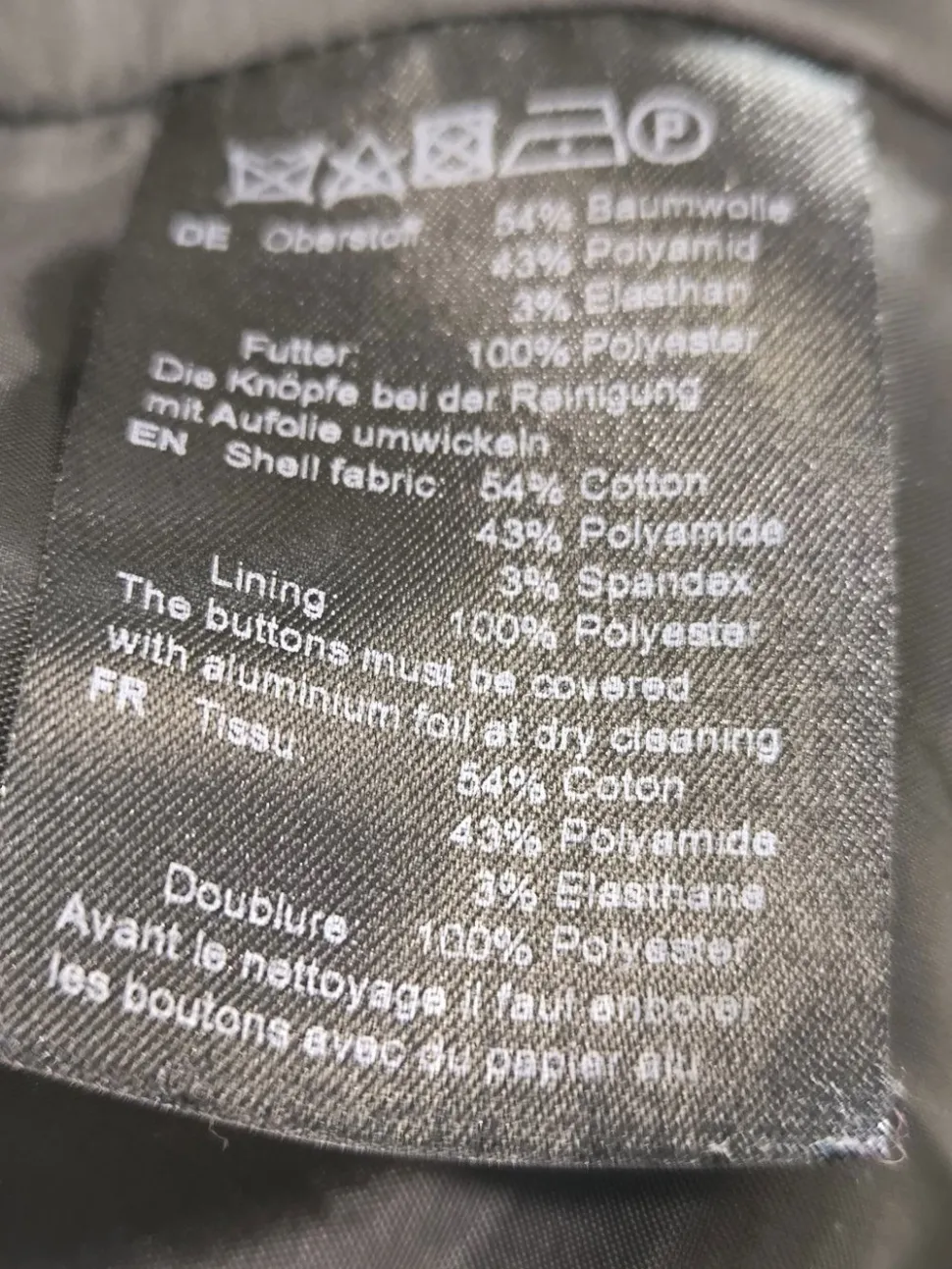 - Außenmaterial: 54% Baumwolle, 43% Polyamid, 3% Elasthan