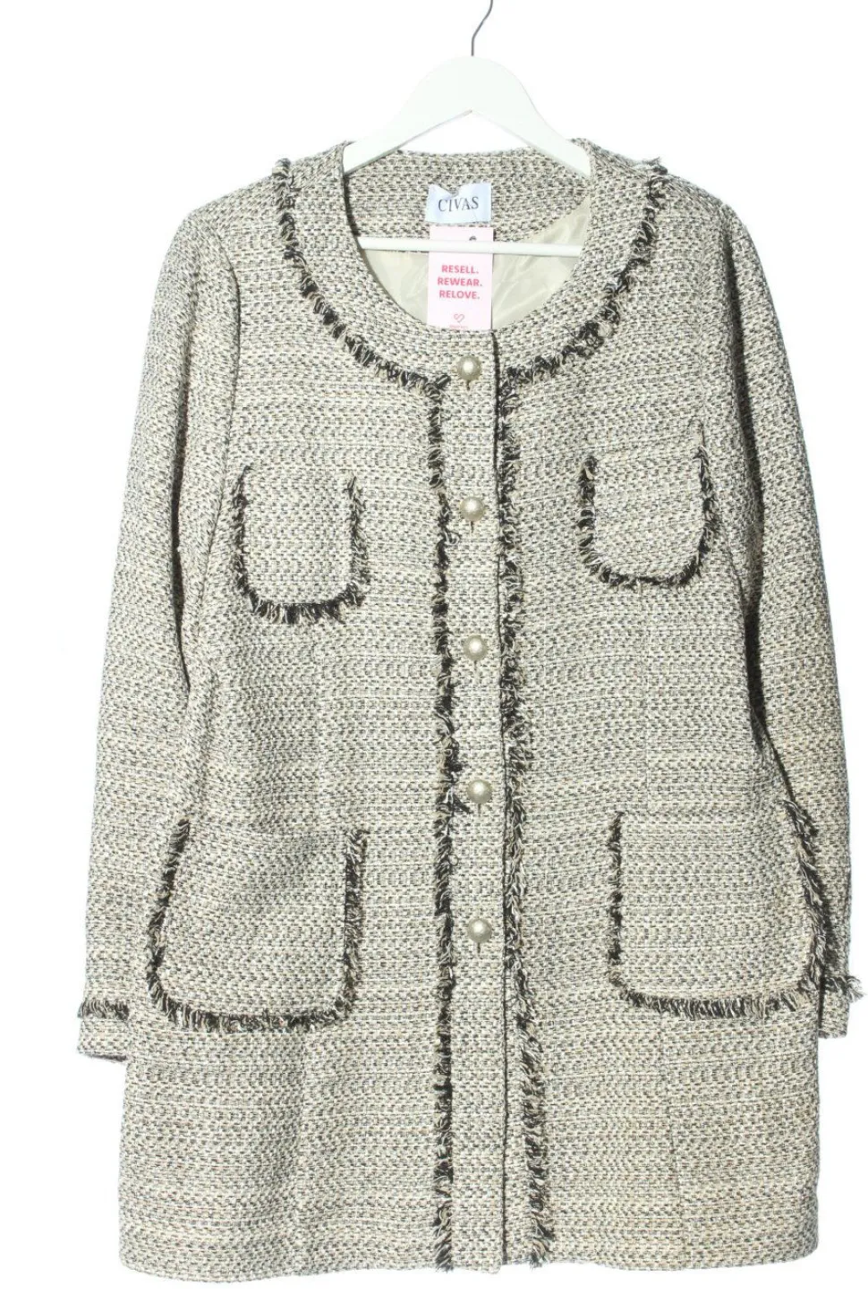 - U-Ausschnitt, angeschnittener Kragen, Bund am Ärmelsaum, Knopfverschluss, aufgesetzte Taschen, Webmuster, Elegant, klassischer Stil, Vintage-Look