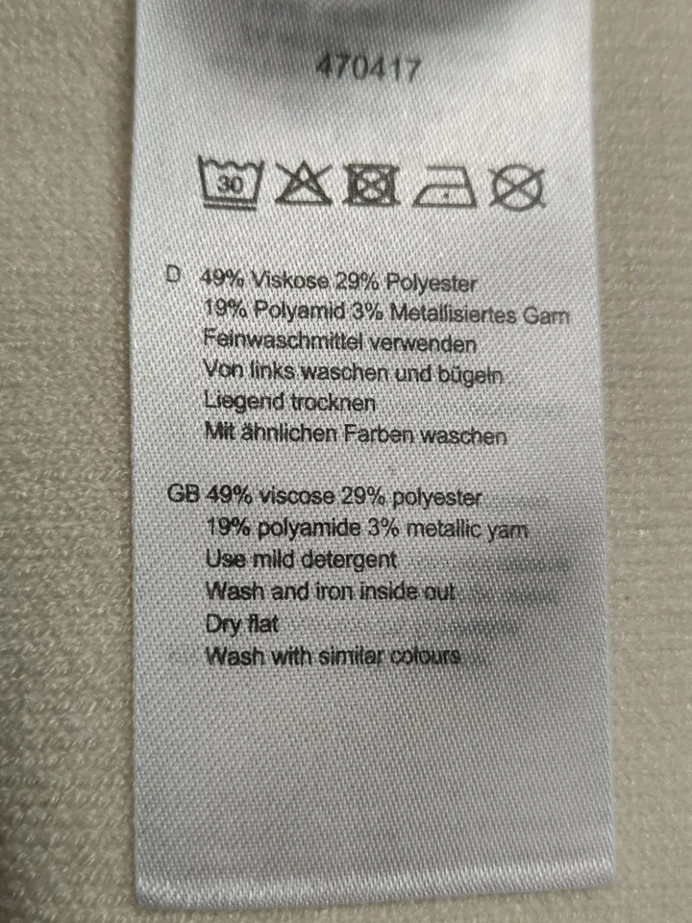 - Außenmaterial: 49% Viskose, 29% Polyester, 19% Polyamid, 3% Metall